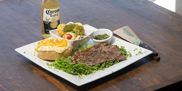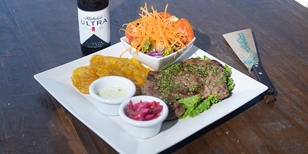 Acompañantes: Ensalada verde, Arroz blanco, Tajadas o Tostones de plátano verde. (Opcional Frijoles Fritos con queso, chimol, escabeche y tajadas o tostones de plátano